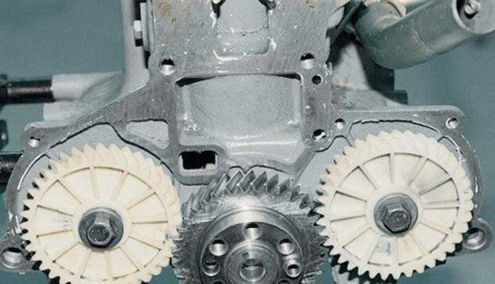 Примечательно, что шестерни изготовлены не из металла, а из текстолита или пластика. Поскольку особой нагрузки при работе эти шестерни не испытывают, то особая прочность им не требуется. К тому же использование текстолита и пластика позволило снизить общий вес силового агрегата.