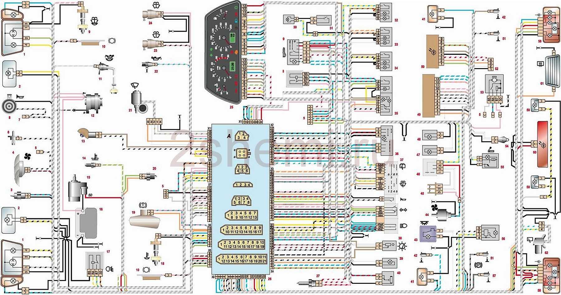 Схема электрооборудования автомобиля 2114: 1 – блок-фара; 2 – противотуманная фара; 3 – датчик температуры окружающего воздуха; 4 – электровентилятор радиатора двигателя; 5 – колодка для подключения к жгуту проводов системы управления двигателем; 6 – выключатель подкапотной лампы; 7 – резервная колодка для подключения звукового сигнала с одним выводом (отрицательный вывод соединен с корпусом); 8 – звуковой сигнал; 9 – датчик уровня жидкости в бачке стеклоомывателя; 10 – датчик износа тормозных колодок; 11 – датчик недостаточного уровня масла; 12 – генератор; 13 – подкапотная лампа; 14 – датчик указателя температуры; 15 – стартер; 16 – аккумуляторная батарея; 17 – реле включения противотуманных фар; 18 – датчик уровня охлаждающей жидкости в расширительном бачке; 19 – датчик недостаточного уровня тормозной жидкости; 20 – выключатель фонарей заднего хода; 21 – мотор-редуктор очистителя ветрового стекла; 22 – датчик аварийного давления масла; 23 – электронасос омывателя заднего стекла; 24 – электронасос омывателя ветрового стекла; 25 – щиток приборов; 26 – монтажный блок предохранителей и реле; 27 – выключатель сигнала торможения; 28 – реле зажигания; 29 -выключатель (замок) зажигания; 30 – лампа освещения вещевого ящика; 31 – выключатель лампы освещения вещевого ящика; 32 – выключатель обогрева заднего стекла; 33 – выключатель заднего противотуманного света; 34 – выключатель противотуманных фар; 35 – комбинированный выключатель габаритного света и света фар; 36 – выключатель аварийной сигнализации; 37 – подрулевые переключатели; 38 – регулятор яркости подсветки приборов; 39 – лампа подсветки рукоятки управления гидрокорректором фар; 40 – розетка для подключения переносной лампы; 41 – боковой указатель поворота; 42 – выключатель освещения салона (датчик открытой передней двери); 43 – плафон освещения салона; 44 – электровентилятор системы вентиляции и отопления; 45 – добавочный резистор электровентилятора системы вентиляции и отопления; 46 – переключатель режимов работы электровентилятора системы вентиляции и отопления; 47 – лампа подсветки рукоятки переключателя режимов работы электровентилятора системы вентиляции и отопления; 48 – лампа подсветки блока управления отопителем; 49 – блок индикации бортовой системы контроля; 50 – маршрутный компьютер; 51 – выключатель освещения салона (датчик открытой задней двери); 52 – колодка для подключения часов; 53 – топливный модуль; 54 – лампа подсветки пепельницы; 55 – прикуриватель; 56 – плафон освещения салона; 57 – выключатель контрольной лампы включения стояночного тормоза; 58 – задний фонарь; 59 – фонарь освещения номерного знака; 60 – дополнительный фонарь сигнала торможения; 61 – нагревательный элемент обогрева заднего стекла; 62 – мотор-редуктор очистителя заднего стекла; А – номера выводов в соединительных колодках.
