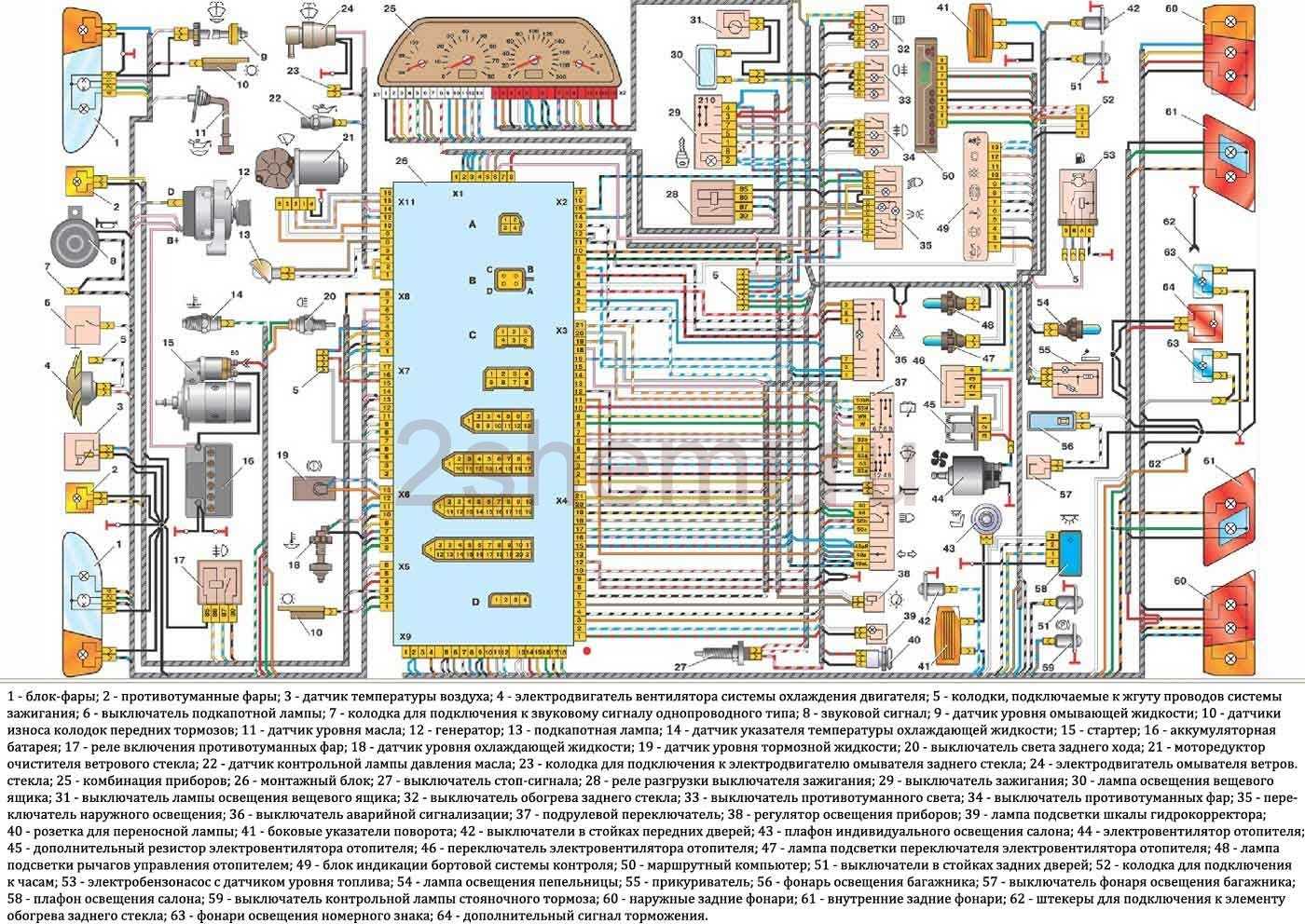 1 – блок-фары; 2 – противотуманные фары; 3 – датчик температуры воздуха; 4 – электродвигатель вентилятора системы охлаждения двигателя; 5 – колодки, подключаемые к жгуту проводов системы зажигания; 6 – выключатель подкапотной лампы; 7 – колодка для подключения к звуковому сигналу однопроводного типа; 8 – звуковой сигнал; 9 – датчик уровня омывающей жидкости; 10 – датчик износа колодок передних тормозов; 11 – датчик уровня масла; 12 – генератор; 13 – подкапотная лампа; 14 – датчик указателя температуры охлаждающей жидкости; 15 – стартер; 16 – аккумуляторная баттарея; 17 – реле включения противотуманных фар; 18 – датчик уровня охлаждающей жидкости; 19 – датчик уровня тормозной жидкости; 20 – выключатель света заднего хода; 21 – моторедуктор очистителя ветрового стекла; 22 – датчик контрольной лампы давления масла; 23 – колодка для подключения к электродвигателю омывателя заднего стекла; 24 – электродвигатель омывателя ветрового стекла; 25 – комбинация приборов; 26 – монтажный блок 2114; 27 – выключатель стоп-сигнала; 28 – реле зажигания; 29 – выключатель зажигания; 30 – лампа освещения вещевого ящика; 31 – выключатель освещения вещевого ящика; 32 – выключатель элемента обогрева заднего стекла; 33 – выключатель фонарей заднего противотуманного света; 34 – выключатель противотуманных фар; 35 – выключатель ламп наружного освещения; 36 – выключатель аварийной сигнализации; 37 – подрулевые переключатели; 38 – выключатель ламп освещения приборов; 39 – лампа подсветки шкалы гидрокорректора фар; 40 – штепсельная розетка для переносной лампы; 41 – боковые указатели поворотов; 42 – выключатель плафона на стойках передних дверей; 43 – плафон индивидуального освещения салона; 44 – электродвигатель вентилятора отопителя; 45 – дополнительный резистор электродвигателя отопителя; 46 – переключатель вентилятора отопителя; 47 – лампа подсветки переключателя отопителя; 48 – лампа подсветки рычагов отопителя; 49 – блок бортовой системы контроля; 50 – маршрутный компьютер; 51 – выключатель плафона на стойках задних дверей; 52 – колодка для подключения жгута проводов системы управления двигателем; 53 – электробензонасос и датчик количества бензина; 54 – лампа подсветки передней пепельницы; 55 – прикуриватель 2114; 56 – лампа освещения багажника; 57 – выключатель лампы освещения багажника; 58 – плафон освещения салона; 59 – выключатель лампы сигнализатора стояночного тормоза; 60 – задние наружные фонари; 61 – задние внутренние фонари; 62 – колодка для подключения к элементу обогрева заднего стекла; 63 – фонари освещения номерного знака; 64 – дополнительный сигнал торможения, расположенный в спойлере.
