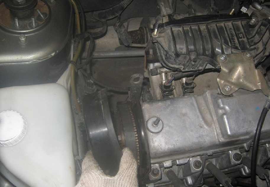 - Чтобы метки на маховике сошлись с таковой на картере КПП (можно наблюдать на лючке), следует прокрутить коленчатый вал. Удобно сделать это, ухватившись за болт крепления шкива.