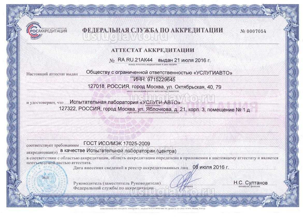 Информация об ИЛ «УСЛУГИ-АВТО» в реестре Федеральной службы по аккредитации (аттестат аккредитации RA.RU.21АК44 от 8.07.2016 г.).