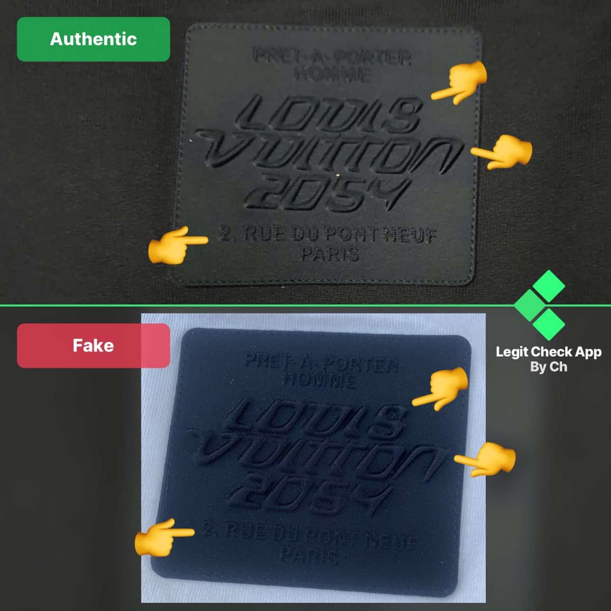 - The fake tee has its “LOUIS VUITTON 2054” text at the wrong thickness.