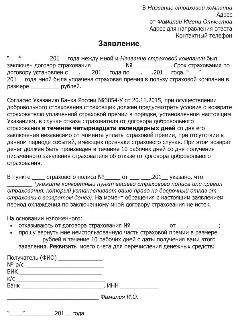 - написать заявление на возврат страховки после досрочного расторжения договора страхования.