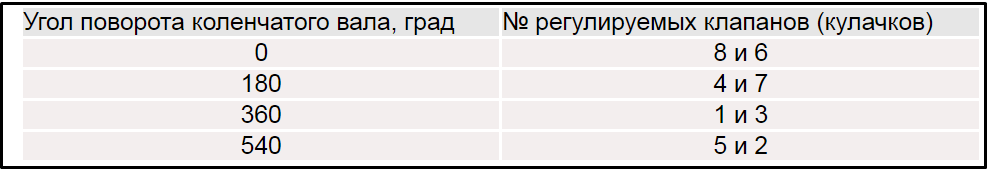 | Угол поворота коленчатого вала | Угол поворота распределительного вала | Номер цилиндра | Номера регулируемых клапанов |