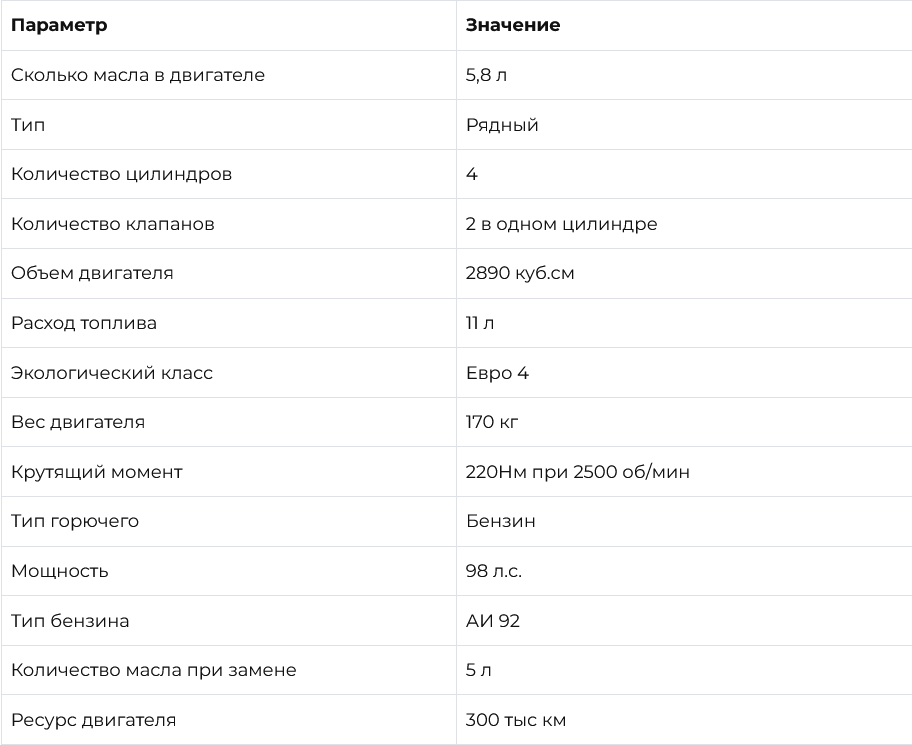 Главная отличительная черта семейства двигателей объемом 2,89 литра – необычная конструкция блока цилиндров. Они залиты тонкостенными чугунными гильзами. Применив оригинальный блок в конструкции, получилось увеличить цилиндра в диаметре (с 92 до 100 мм), обеспечить его жесткость и уменьшить влияние продолжительной эксплуатации на гильзы. Таким образом, расход масла сократился, а технические характеристики значительно улучшились.