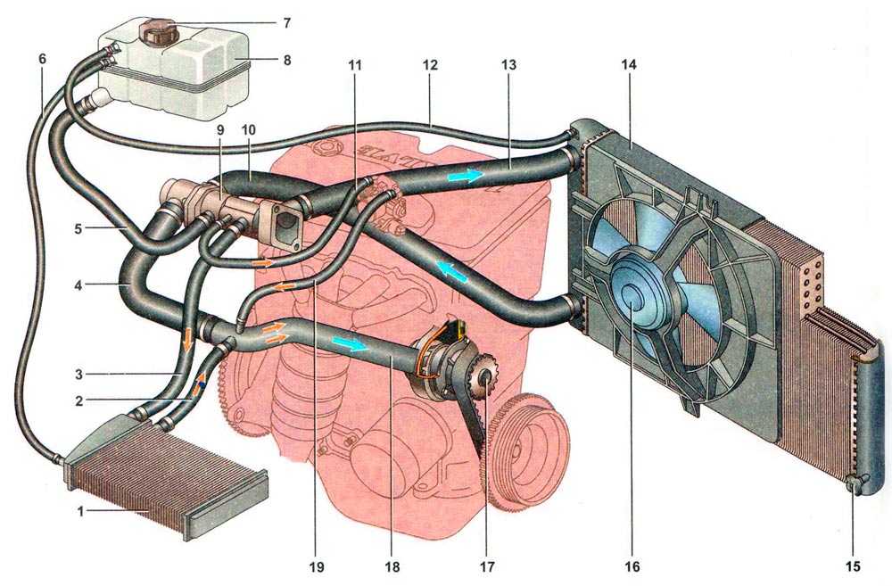 Принцип работы системы охлаждения ВАЗ 2110 с 16-ти клапанной форсункой: 1 — радиатор отопителя; 2 — шланг для слива охлаждающей жидкости с радиатора отопителя; 3 — шланг подачи охлаждающей жидкости к радиатору отопителя; 4 — шланг от насоса охлаждающей жидкости; 5 — патрубок расширительного бачка; 6 — патрубок отвода пара радиаторного отопителя; 7 — крышка расширительного бачка; 8 — расширительный бачок; 9 — термостат; 10 — шланг для снятия охлаждающей жидкости с радиатора двигателя; 11 — патрубок для подачи жидкости к дроссельному узлу; 12 — патрубок отвода пара радиатора двигателя; 13 — шланг для подачи жидкости к радиатору двигателя; 14 — радиатор двигателя; 15 — пробка сливного отверстия радиатора; 16 — электровентилятор радиатора двигателя; 17 — насос охлаждающей жидкости; 18 — подающий патрубок насоса охлаждающей жидкости; 19 — патрубок для отвода охлаждающей жидкости из дроссельного узла.