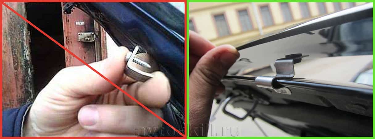 Важно во время монтажа вставить скобки заусенцами в сторону салона. Сначала устанавливают распорки, затем приклеивают дугу. После поднятия стекла крепежные детали прочно фиксируют защиту
