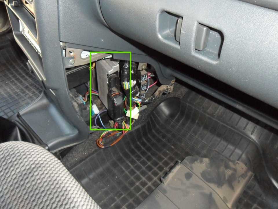Расположен блок в торпеде, непосредственно под приборкой. Чтобы провести замену или демонтаж, нужно выкрутить саморезы и извлечь панель с бока, со стороны пассажирского места. Через образовавшееся отверстие можно рассмотреть корпус ЭБУ – он установлен внутри стального фиксатора.