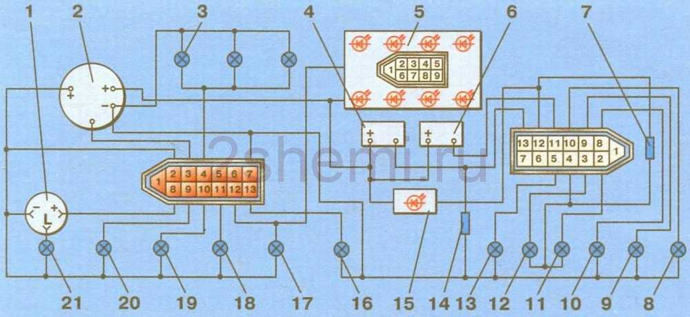 1 – реле-прерыватель контрольной лампы стояночного тормоза; 2 – тахометр со стабилизатором напряжения; 3 – лампа освещения комбинации приборов; 4 – указатель температуры; 5 – блок управления БСК; 6 – указатель уровня топлива; 7 – резистор 50 Ом, 5 Вт; 8 – контрольная лампа «CHECK ENGINE» для системы снижения токсичности; 9 – контрольная лампа дальнего света фар; 10 – контрольная лампа габаритного света; 11 – резервная контрольная лампа; 12 – контрольная лампа не пристегнутых ремней безопасности; 13 – контрольная лампа левых указателей поворота; 14 – резистор 470 Ом, 0,25 Вт; 15 – электронный вольтметр; 16 – контрольная лампа правых указателей поворота; 17 – контрольная лампа аварийного давления масла; 18 – контрольная лампа резерва топлива; 19 – контрольная лампа воздушной заслонки карбюратора; 20 – контрольная лампа «CHECK ENGINE» для системы впрыска топлива; 21 – контрольная лампа стояночного тормоза.