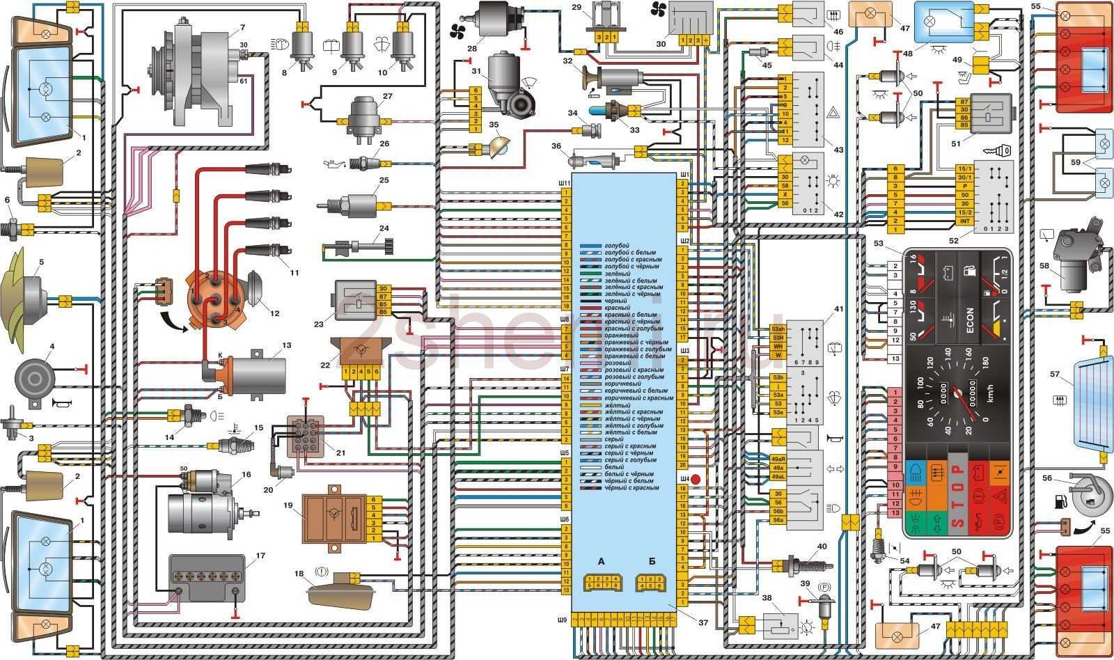 С середины 90-х годов на ВАЗ 2109 стали применяться двигатели с системой впрыска, что сильно изменило электрический план моторного отсека и панели приборов. Ниже представлена схема электрики машины 1999 года с ЭСУД типа GM ISFI-2S и Январь 4/4.1.