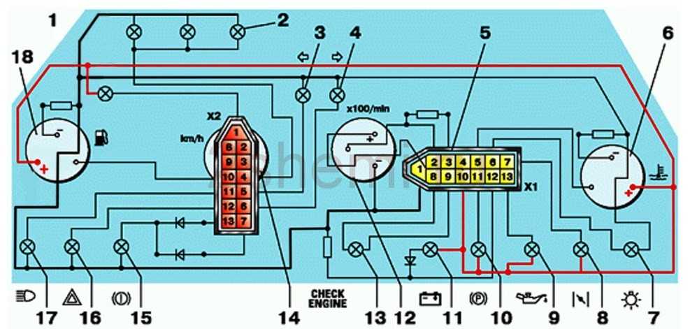 1 — тахометр; 2 — лампа освещения комбинации приборов; 3 — указатель температуры; 4 — блок управления БСК; 5 — указатель уровня топлива; 6 — контрольная лампа «CHECK ENGINE» для системы снижения токсичности; 7 — контрольная лампа дальнего света фар; 8 — контрольная лампа габаритного света; 9 — резервная контрольная лампа; 10 — контрольная лампа не пристегнутых ремней безопасности; 11 — контрольная лампа левых указателей поворота; 12 — контрольная лампа заряда аккумуляторной батареи; 13 — контрольная лампа правых указателей поворота; 14 — контрольная лампа аварийного давления масла; 15 — контрольная лампа резерва топлива; 16 — контрольная лампа воздушной заслонки карбюратора; 17 — контрольная лампа «CHECK ENGINE» для системы впрыска топлива; 18 — контрольная лампа стояночного тормоза; В1 — резистор 91 кОм; В2 — резистор 50 Ом, 5 Вт.