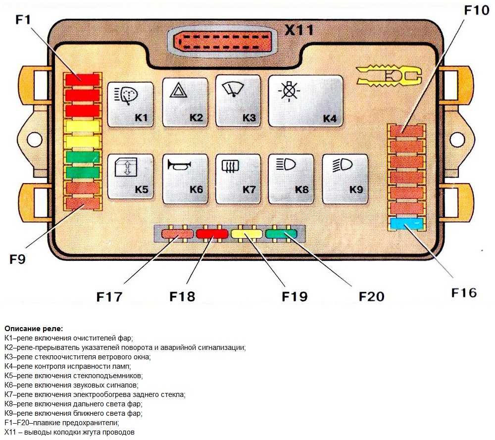 - F5 — с током 20 А — защищает цепи гудка-сигнала и его переключатель, а также электрический движок вентилятора охлаждающей системы.