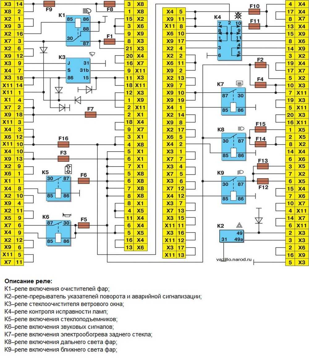К2 – реле-выключатель указателей поворота и аварийной сигнализации. Если перестали работать поворотники или аварийная группа, проверьте предохранители F2 и F16, это реле. Если аварийная группа работает, но нет поворотников, проверьте ручку включения, ее контакты и разъем. Если выходит из строя только аварийный браслет, проверьте кнопку включения, контакты и проводку. Не забудьте проверить лампочки указателей поворота. Возможно короткое замыкание в одной из фар. Внимательно осмотрите разъемы и проводку на предмет повреждения изоляции.