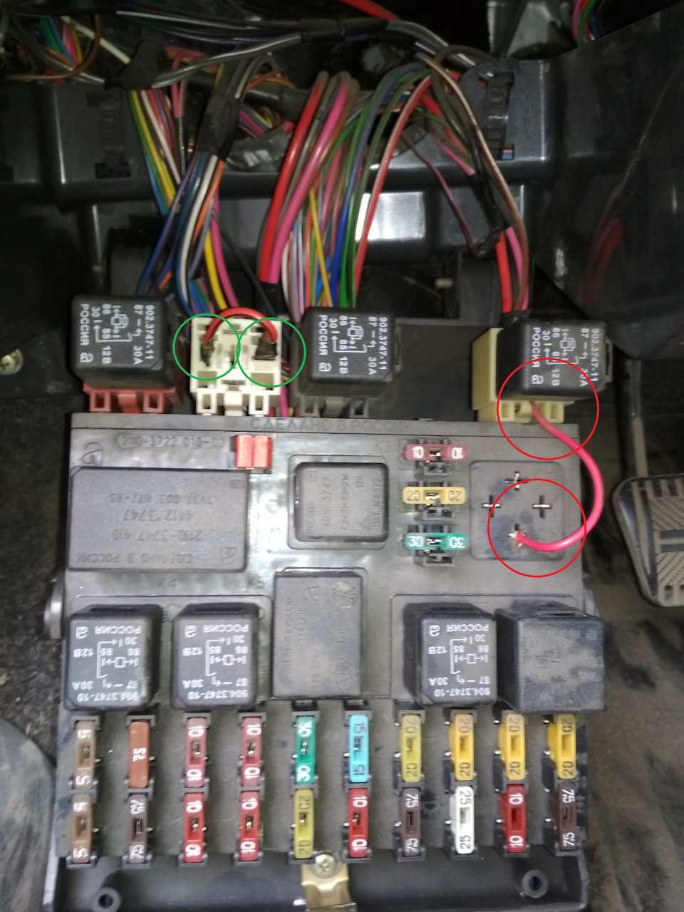 - Отмеченное зеленым — закороченное реле стеклоподъемников, позволяет опускать и поднимать стекла при выключенном зажигании.