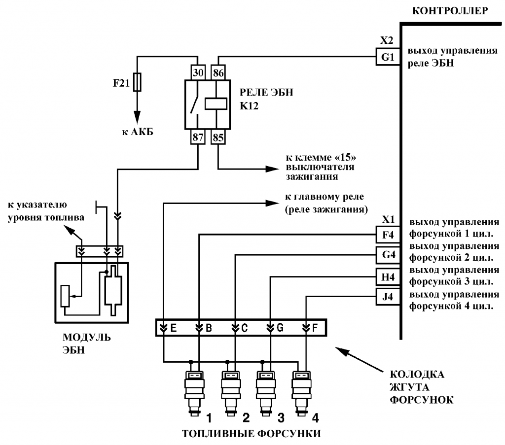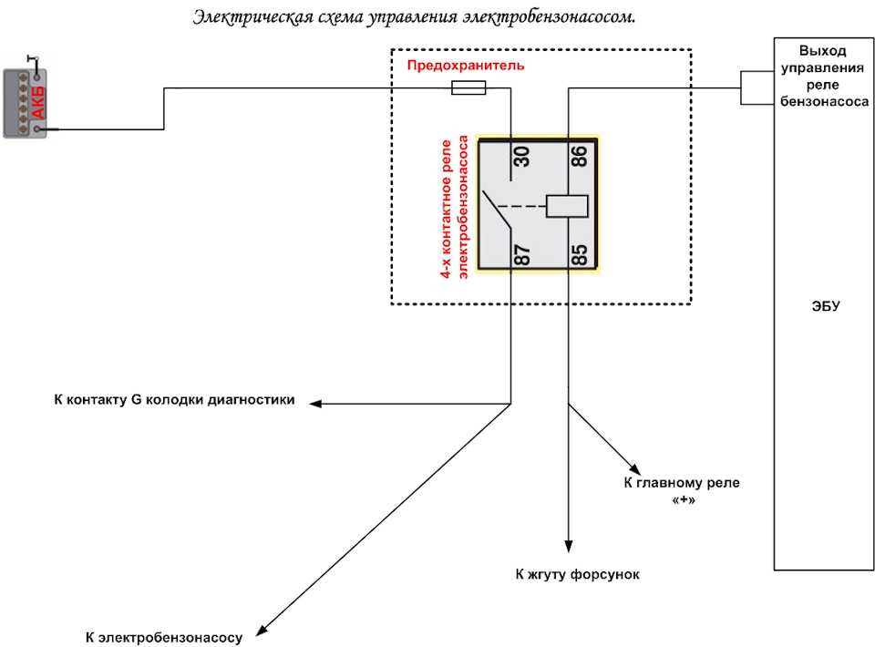 Начнем с того, что управление бензонасосом через реле происходит по следующей общей схеме: