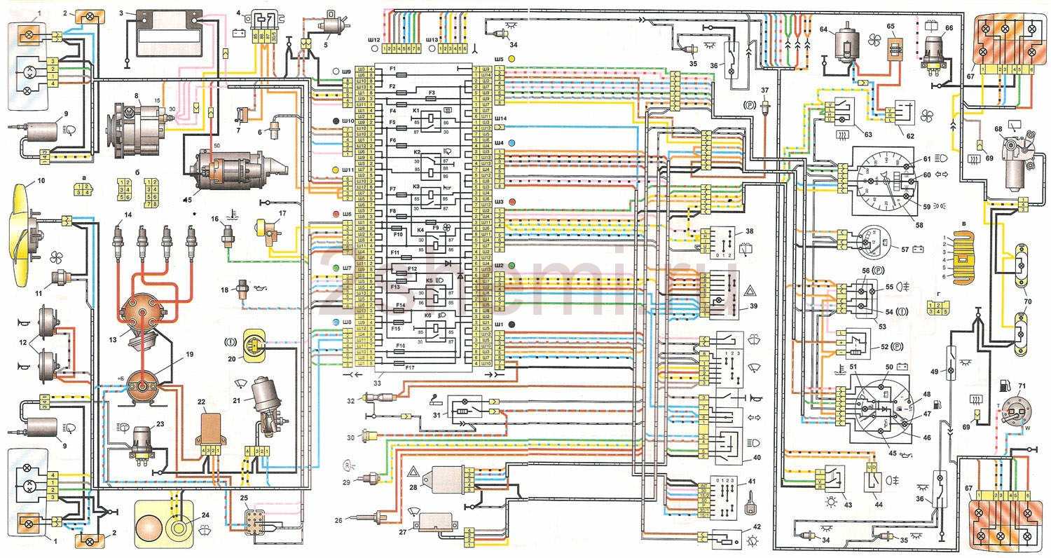 Схема ВАЗ-2104, для автомобилей ранних годов выпуска. От стандартной схемы ее отличают генератор Г-222, 10-ти контактный включатель аварийной сигнализации, 5-ти контактное реле указателей поворотов и аварийной сигнализации, датчик верхней мертвой точки 1-го цилиндра, колодка диагностики, лампа-индикатор обогрева заднего стекла непосредственно в выключателе, отсутствие контрольной лампы воздушной заслонки карбюратора, двухпозиционный выключатель внешнего освещения и трехпозиционный подрулевой переключатель света.