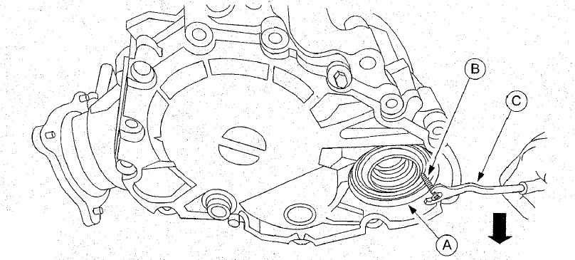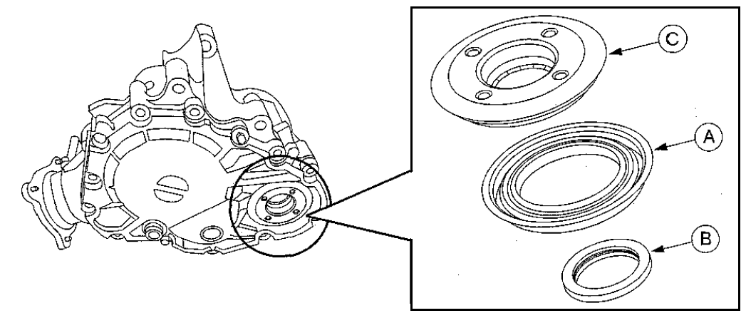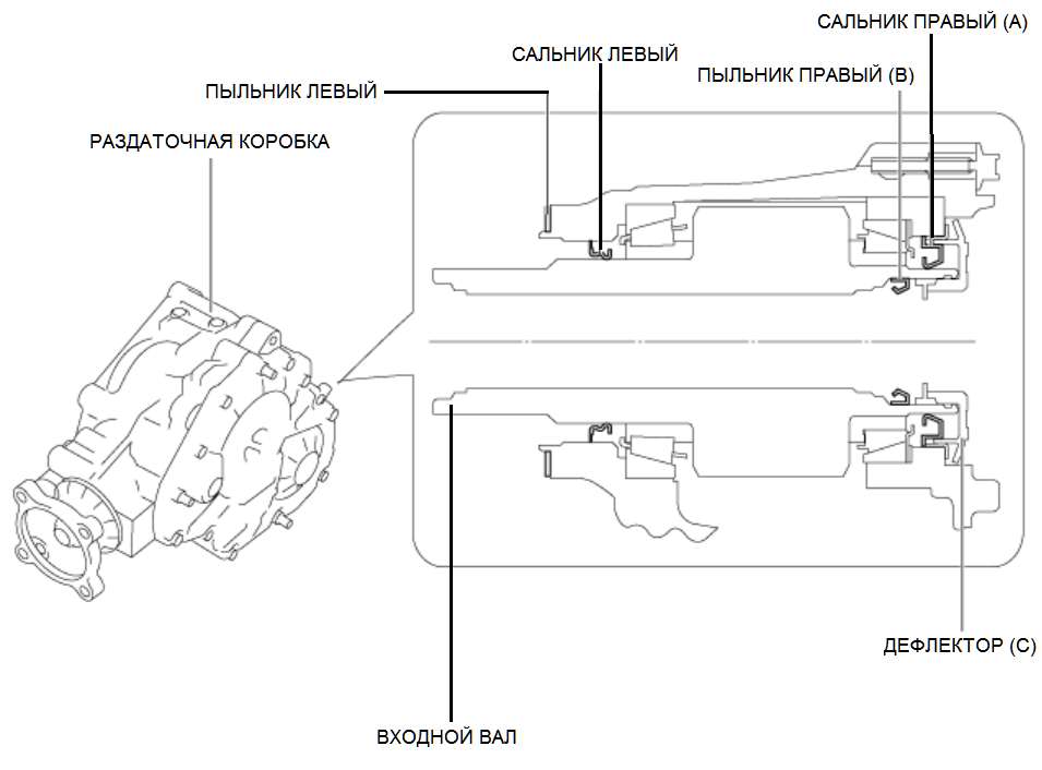 Если необходима замена правого сальника раздаточной коробки (A) и пыльника уплотнения раздаточной коробки (В), Мазда рекомендует использовать следующую процедуру ремонта по установке новых сальников. Дефлектор (C) предохраняет рабочие поверхности уплотнений коробки от попадания абразивных частиц, и его нельзя использовать повторно.