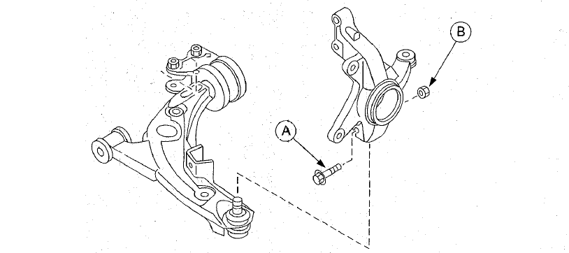 2. Выбейте контрящую деформированную часть гайки наружу с помощью небольшой выколотки и молотка. 3. Для снятия гайки ступицы переднего колеса нажмите тормозную педаль, чтобы привод не вращался. 4. Ослабьте гайку ступицы колеса так, чтобы гайка была заподлицо с концом приводного вала. 5. Ударьте по гайке ступицы медным молотком или, используя выколотку, отсоедините приводной вал от ступицы переднего колеса. Снимите и утилизируйте гайку ступицы колеса. 6. Снимите компонент тормозного суппорта с поворотного кулака и подвесьте его на проволоке. 7. Снимите болт (А) и гайку (В) переднего шарового шарнира нижнего рычага. Затем отделите нижний рычаг от поворотного кулака.