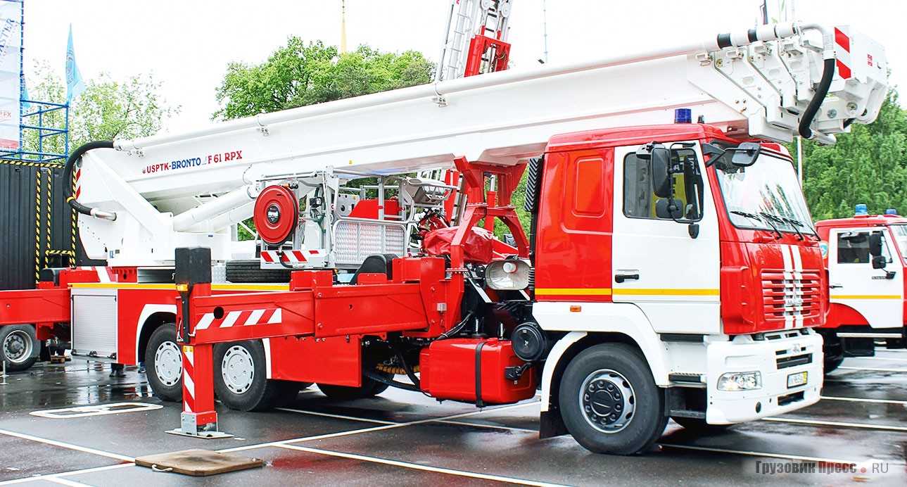Пожарный телескопический коленчатый подъёмник Bronto SkyLift F61 RPX смонтирован на шасси МАЗ-6312В5 6х4 с 412-сильным дизелем. Для УСПТК это ново, так как минские машины вообще редко используют в России для монтажа пожарного оборудования.