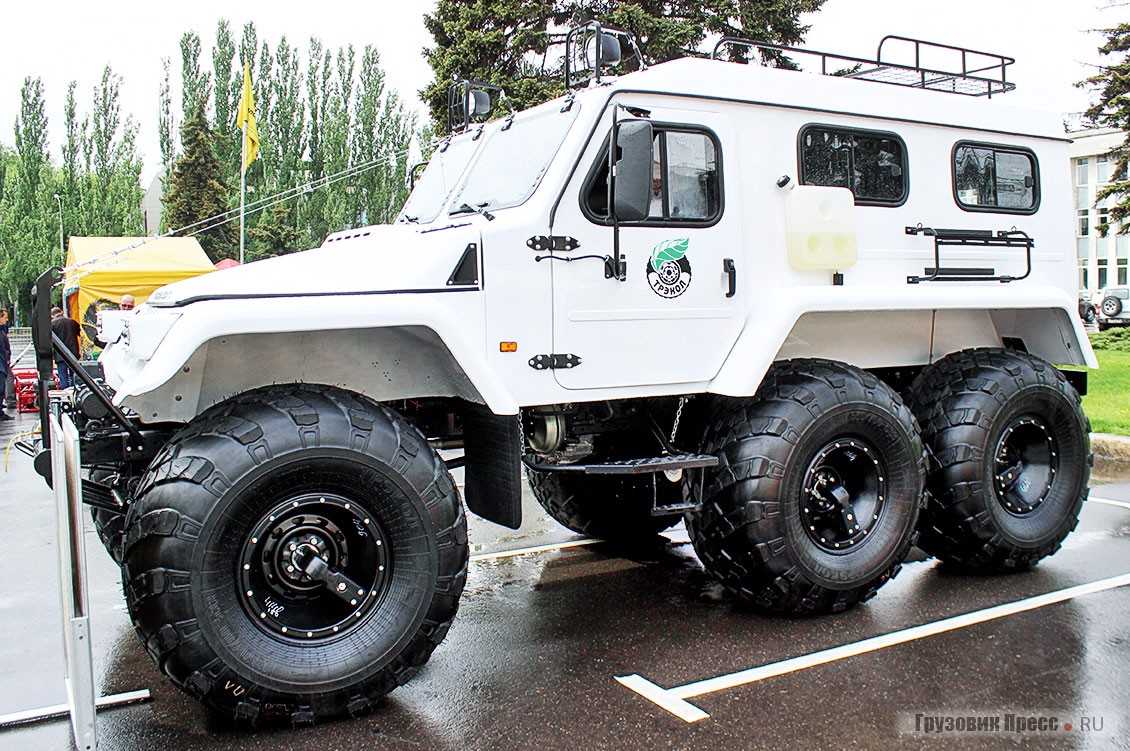 Бигфуты компании ООО «НПО ТРЭКОЛ» из Люберец как-то даже язык не поворачивается назвать джипами, настолько они огромны. Габаритные размеры флагмана «Трэкол-39294» подстать грузовику – 5610х2540х2680 мм. Благодаря кузову из стеклопластика 6-колёсные вездеходы весят не так уж и много – всего 2,8 т. Шестиместный пассажирский отсек с сиденьями вдоль бортов раскладывается в диван. Машина рассчитана на транспортировку 700 кг груза по твёрдой поверхности, тогда как на плаву она снижается до 400 кг. На выбор предложено два двигателя: 130-сильный бензиновый ЗМЗ-406.20F и турбодизель Hyundai D4BF мощностью 83 л.с.