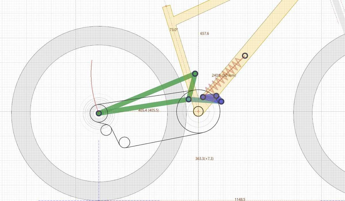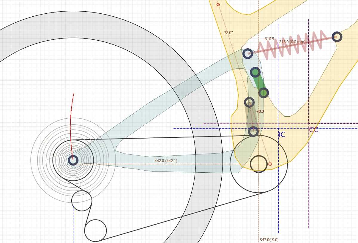 ) при работе подвески практически не ощущается. Маркетологи частенько заявляют, что такая конструкция позволяет добиться едва ли не прямой линии движения задней оси во время работы подвески. Во времена отсутствия специального ПО разные компании (например, Specialized) тоже хвастались, что их траектория движения задней оси «вертикальна», но это всё маркетинговые уловки. По факту — это не так, на скриншоте ниже красным выделена траектория задней оси, как видите — это С-образная кривая, хоть и весьма плоская.