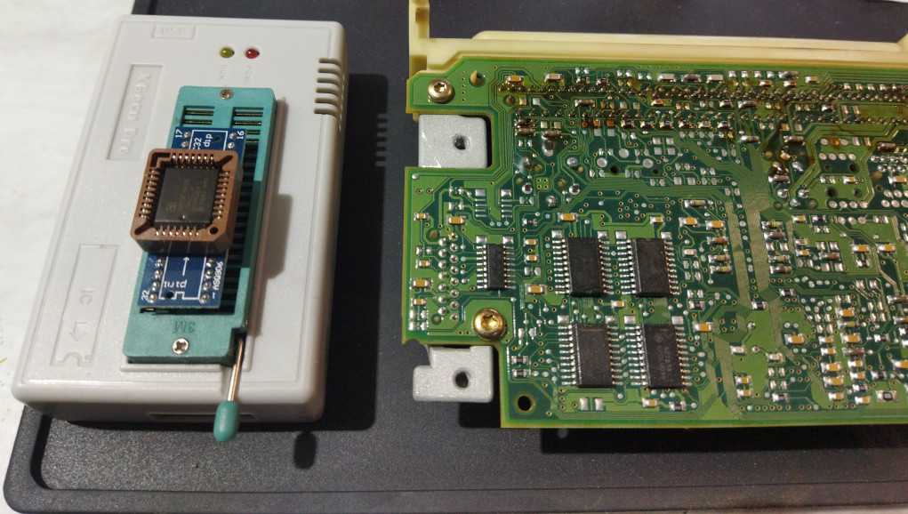 На фото выше, пример микросхемы флэш в корпусе PLCC, установленной в панельку для чтения/записи через программатор.