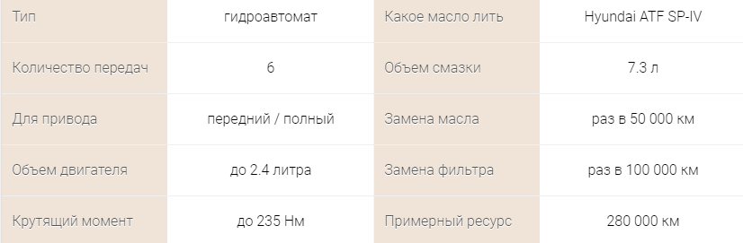 Автомат вмещает в себя 7.3 литра трансмиссионной жидкости стандарта Hyundai ATF SP-IV. Регламент предписывает производить замену масла каждые 90 тыс.км., но владельцы придерживаются интервала в 60 тыс.км. Впервые данная коробка появилась на внедорожниках SsangYong, так что найти масло не составит труда.