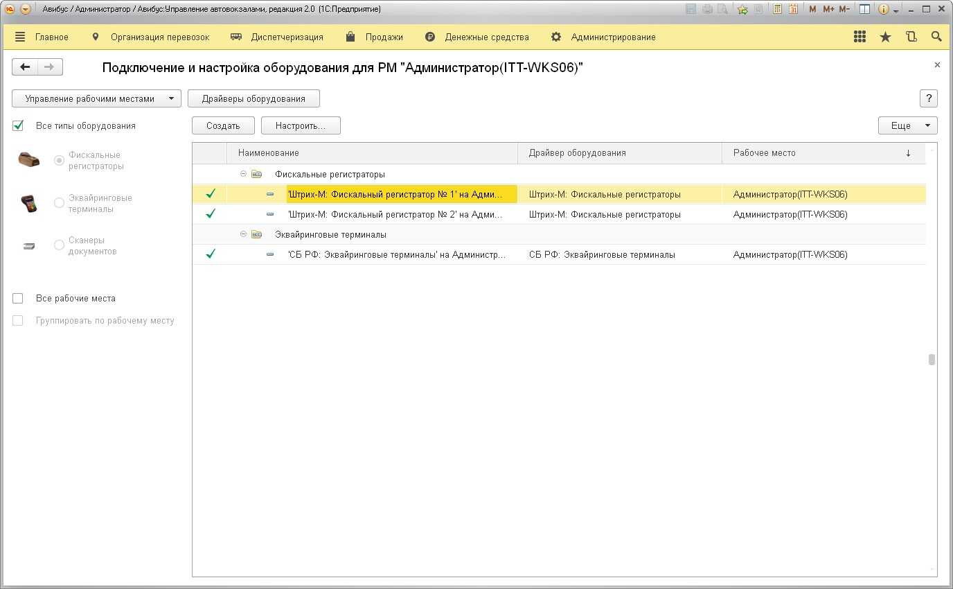 В справочнике Подключаемое оборудование создаются конфигурации рабочих мест. Запись в справочнике связывает конкретное рабочее место (пользователь, компьютер), конфигурацию оборудования и физический экземпляр оборудования, при этом один и тот же экземпляр, рабочее место, пользователь могут использоваться в нескольких записях.