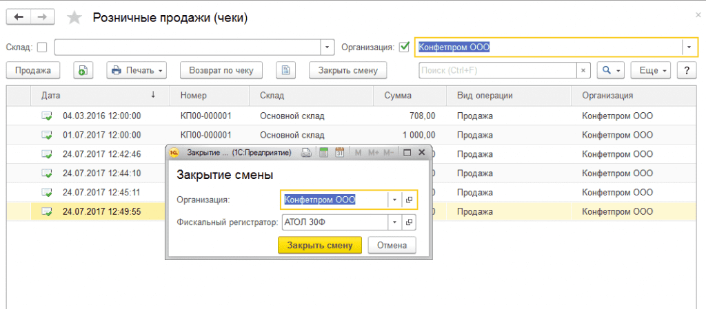Перед началом работы необходимо указать физическое лицо — кассира для текущего пользователя программы в разделе Администрирование – Настройки прав пользователя и выполнить открытие смены (раздел Банк и касса – Управление фискальным устройством)