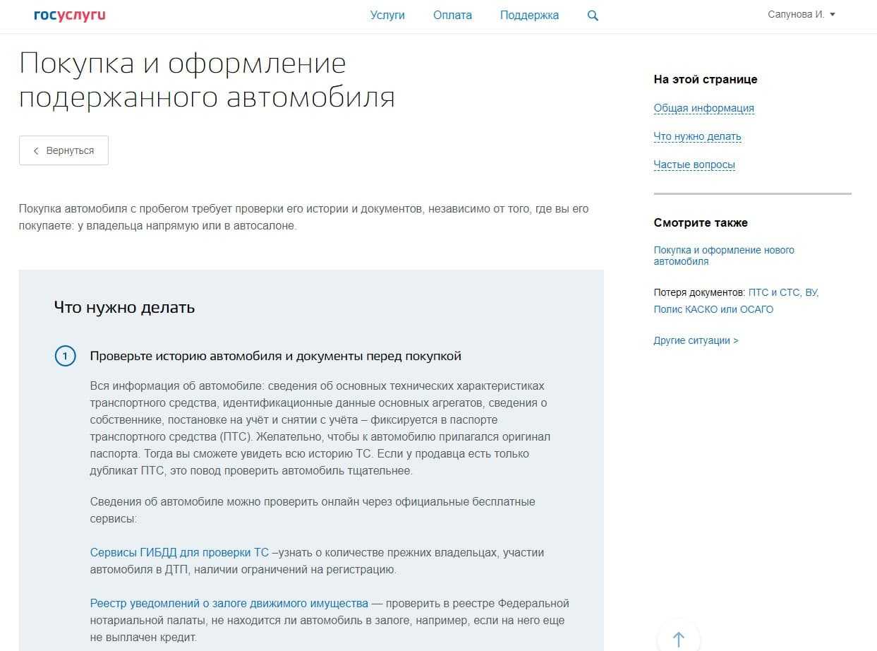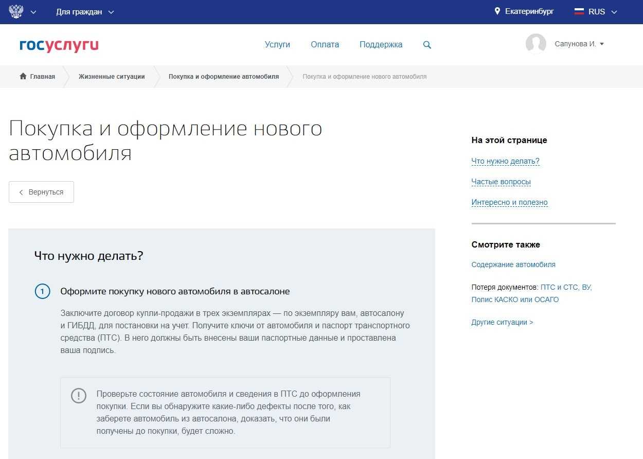 Если подаете заявление на регистрацию новой машины из салона, то выберите «Покупка и оформление нового автомобиля». После этого откроется страница «Что нужно делать?».
