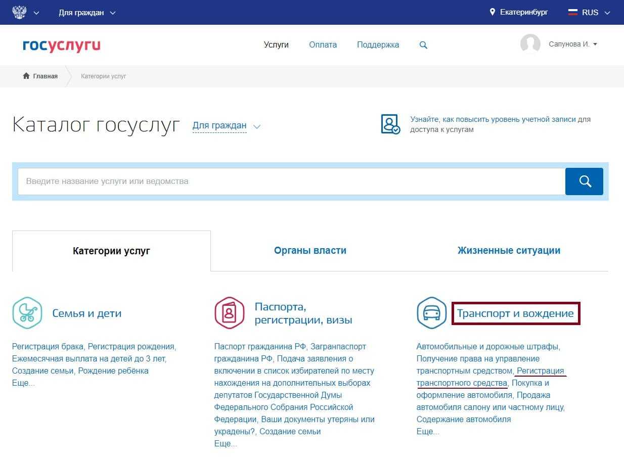 В открывшемся окошке — «Каталог госуслуг» — выбираем пункт «Транспорт и вождение».