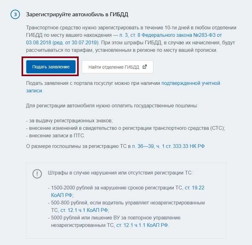 Спуститесь до пункта 3 «Зарегистрируйте автомобиль в ГИБДД» и нажмите на кнопку «Подать заявление».