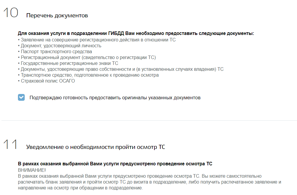 Эти документы вам понадобятся для заполнения онлайн-заявления на регистрацию автомобиля. Дополнительно в ГИБДД нужно будет принести квитанцию об оплате госпошлины, действующую диагностическую карту и, при наличии, государственный знак «Транзит».