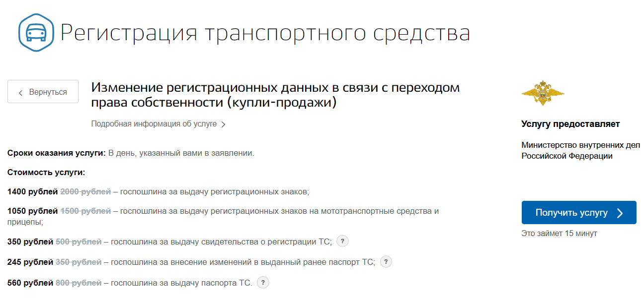 Если вы приобрели машину по договору купли-продажи, подать заявление на ее регистрацию и записаться на прием в ГИБДД также можно через Госуслуги. Для начала ознакомьтесь с размером госпошлины за это действие