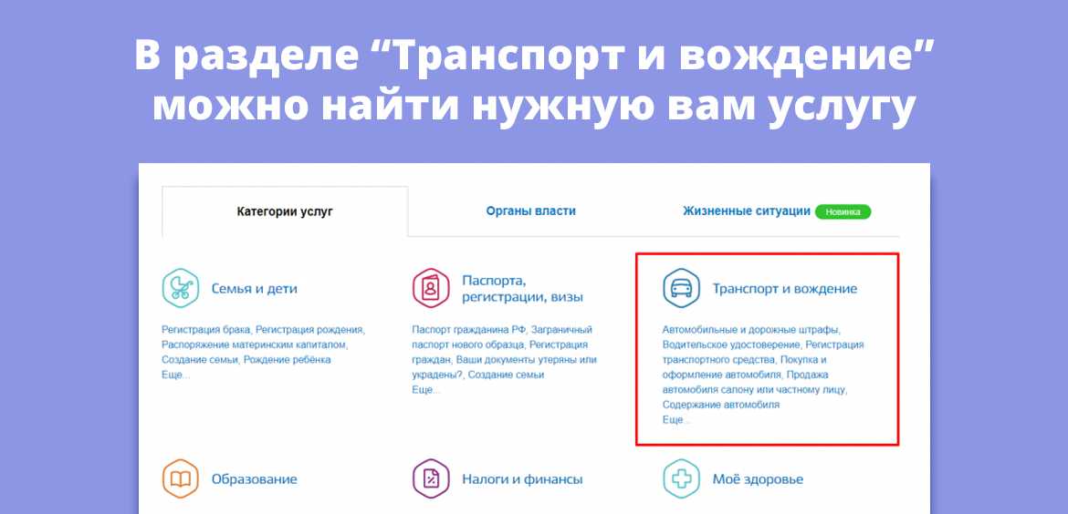 В целом, запись возможна при любых действиях, связанных с транспортными средствами и водительскими удостоверениями. На сайте Госуслуг есть раздел “Транспорт и вождение”, в котором перечислены все возможные госуслуги с возможностью подачи заявки на их исполнение.