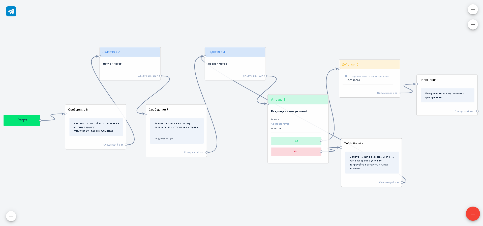 1. Сообщение 6, в котором будет предоставлена ссылка на вступление в группу2. Задержка 2 на N часов/минут/дней3. Сообщение 7 с ссылкой на совершение оплаты для оплаты подписки на вступление в группу. На странице оплаты нужно поставить присвоение уникальной метки для отслеживания оплаты пользователем4. Задержка 3 на N часов/минут/дней5. Условие 3 с проверкой метки, которая присваивается на странице оплаты после совершения успешного платежа.6. В зависимости от оплаты.- Если оплата не прошла успешно, то переход к шагу с Сообщением 9, что оплата не была успешной либо не была совершена. И после этого возврат к Задержке 3 перед Условием 3 с проверкой метки оплаты.- Если оплата прошла успешно, то переход в Действие 5 с одобрением вступления пользователя в группу/канал.7. Сообщение 8 с оповещением об успешном вступлении в группу/канал
