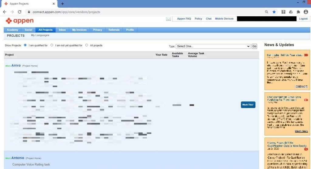 Appen Connect is the platform used by Appen to manage the crowd working on remote projects, from recruiting to billing and payment. Through Appen Connect, the independent contractor applies to work for the different projects available, carries out the qualification process, and accesses the specific work tools for each project.