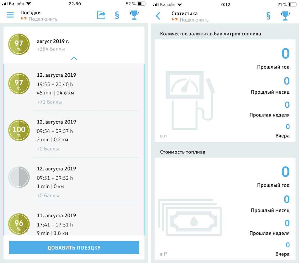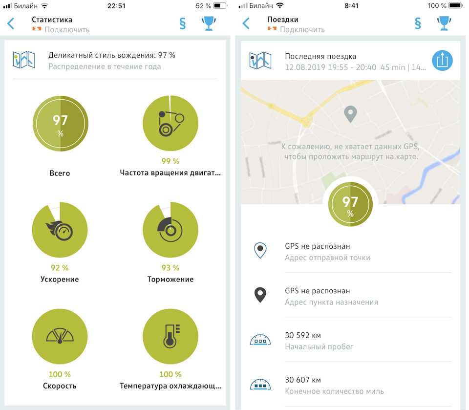 Со статистикой все прям совсем грустно. VW Connect собирает статистику только по поездкам, во время которых приложению удалось подключиться к DATAPLUG.