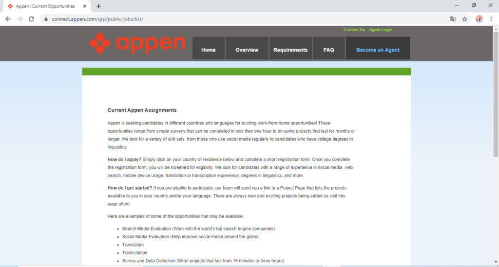 The first step in becoming an agent is to create an account on Appen Connect. To do this, you must access the registration site. You can click on Become an Agent in the top right corner of the home page or go directly to https://connect.appen.com/qrp/public/jobs/list.