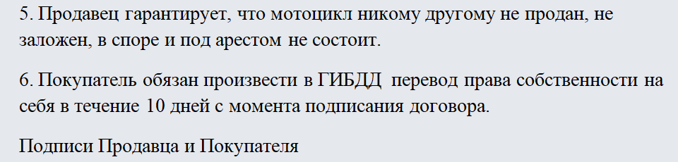 - В п.3.1 фиксируем срок, в течение которого продавец должен передать мотоцикл новому владельцу.