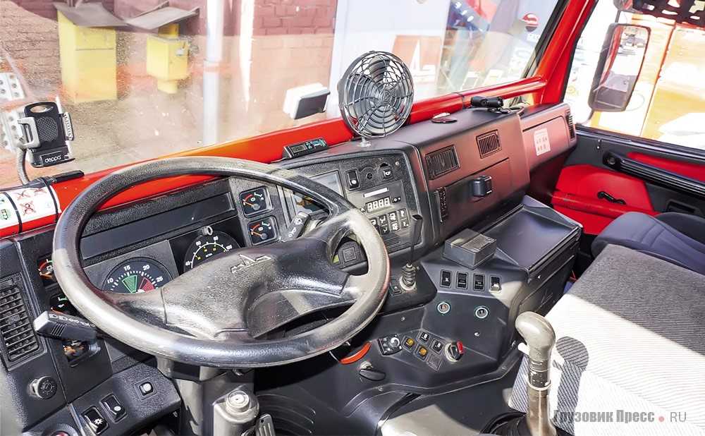 Несмотря на внушительный вид, полный привод и немалый вес надстройки, двигатель разгоняет «техничку», как надо. Хочешь, можно неспешно перебирать передачи, и МАЗ будет с «тепловозной» монотонностью набирать скорость. А хочешь, можно заваливая стрелку тахометра за границу «зелёной зоны» и активно работая рычагом КП, получить пусть и не гоночный, но довольно резвый разгон.