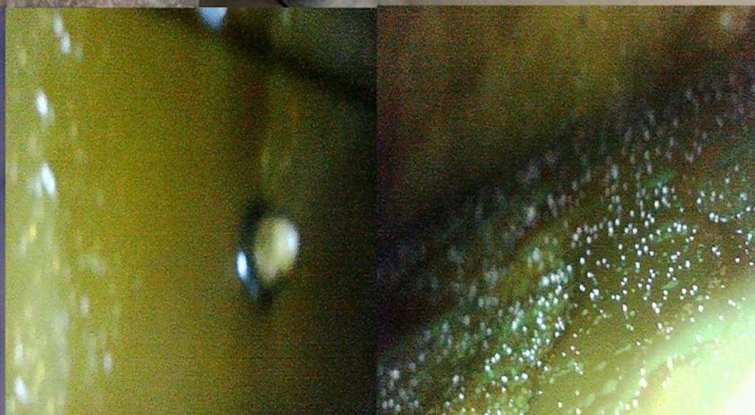 На фото с эндоскопа видно, как нужно правильно задувать антикором (любого типа) закрытые полости кузова: препарат (желто-коричневого цвета) лежит равномерно на всех поверхностях.