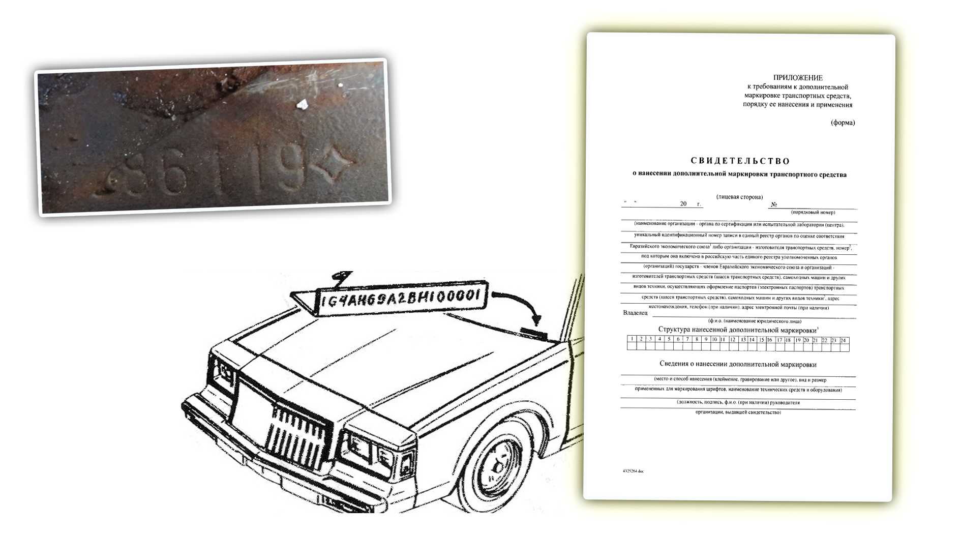 Согласно новым правилам регистрации транспортных средств, вступающим в силу 1 января 2020 года, вводится понятие «дополнительная маркировка транспортного средства» (основного компонента транспортного средства). Напомним, что в настоящий момент для транспортных средств предусмотрена только основная заводская маркировка кузова или рамы.