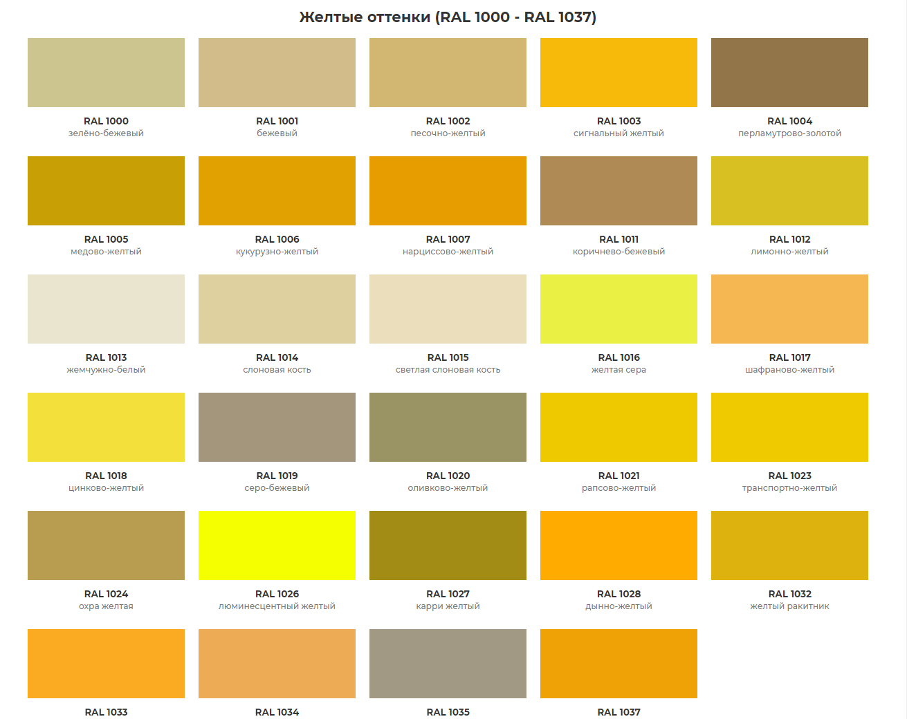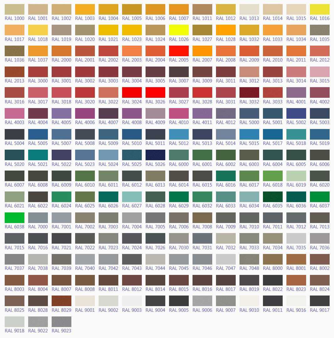 Полная палитра оттенков RAL широка и разнообразна. В неё входят различные комбинации, включенные в каталоги электронного и печатного вида.