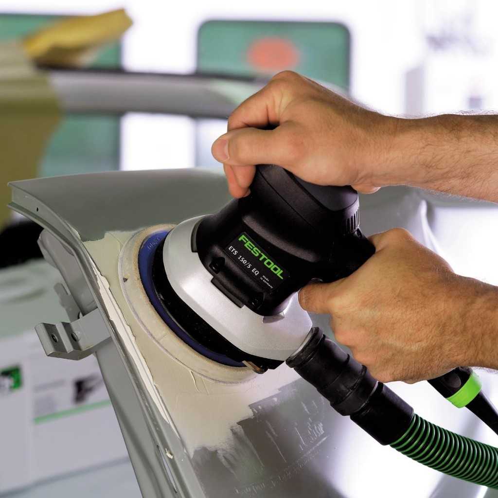 Шлифование шпатлевки с помощью профессиональной эксцентриковой шлифовальной машинки Festool ETS 150/5 EQ