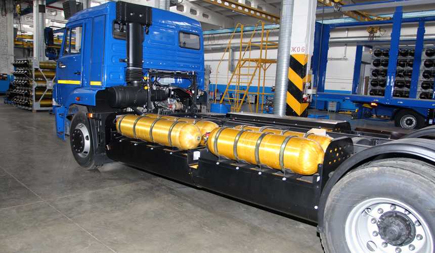 Вот в цеху оснащается газовым оборудованием очередной КАМАЗ. Восемь металлокомпозитных баллонов размещены в специальных коробах и закреплены на раме с обеих сторон. Установка дополнительных шлангов и патрубков — неотъемлемая часть переделки. Стоит такой газовый КАМАЗ-65117 с индексом 35 чуть больше четырех миллионов рублей, тогда как аналогичный дизельный — на миллион рублей дешевле.