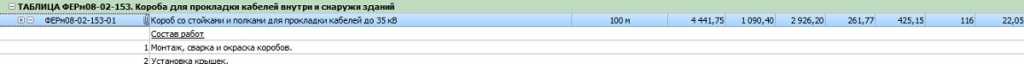 Также возможно применение расценки в смете на кабель в коробах по установленным стойкам и полкам. Данный вид работ можно учесть в локальной смете, смете по форме №4 и в других сметных документах, опираясь на раздел 2 того же монтажного сборника 08. Норма под шифром ФЕРм08-02-153-01 звучит как «Короб со стойками и полками для прокладки кабелей до 35 кВ» и учитывает в составе своих работ затраты на монтаж, сварку и окраску грунтовкой коробов и закрытие их крышками после прокладки кабельного изделия. Таким образом, данная норма также может подойти в качестве расценки в смете на монтаж кабель-каналов. Измеряется объем работ также в 100м. Это наглядно можно увидеть на рисунке 1.