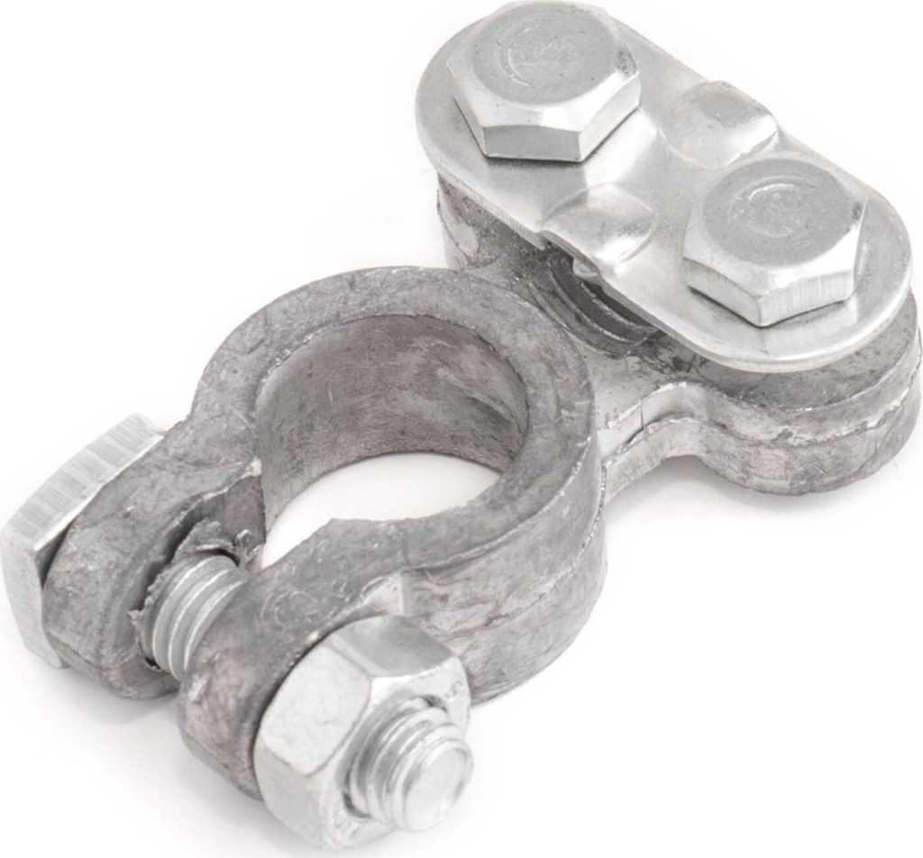 - Свинцовые клеммы. Начнём с самых популярных и, как следствие, самых распространённых аккумуляторных клемм, а именно свинцовых. Эти недорогие клеммы отличаются отличными характеристиками за счёт своей высокой проводимости, устойчивости к коррозии (следовательно, вам не придётся часто задаваться вопросом «Как зачистить клеммы аккумулятора») и прекрасным взаимодействием с электролитом (а точнее с его отсутствием, поскольку свинец не создаёт так называемую гальваническую пару). Мягкость свинцовых клемм благоприятствует качественному обжиму, благодаря которому переходник на аккумуляторные клеммы будет максимально плотно к ним прилегать, обеспечивая тем самым лучшую электропроводность. Но, с другой стороны, мягкость, а точнее легкоплавность свинца, можно назвать, пожалуй, единственным недостатком – в жаркую погоду, когда температура под капотом достигает максимума, свинцовые клеммы могут оплавляться.