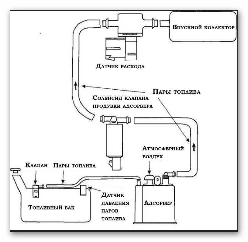 1. В бензобаке скапливаются пары бензина, которые адсорбер забирает и впрыскивает в дроссель при помощи клапана продувки. Там пары смешиваются с воздухом и обогащают бензиновую смесь.
