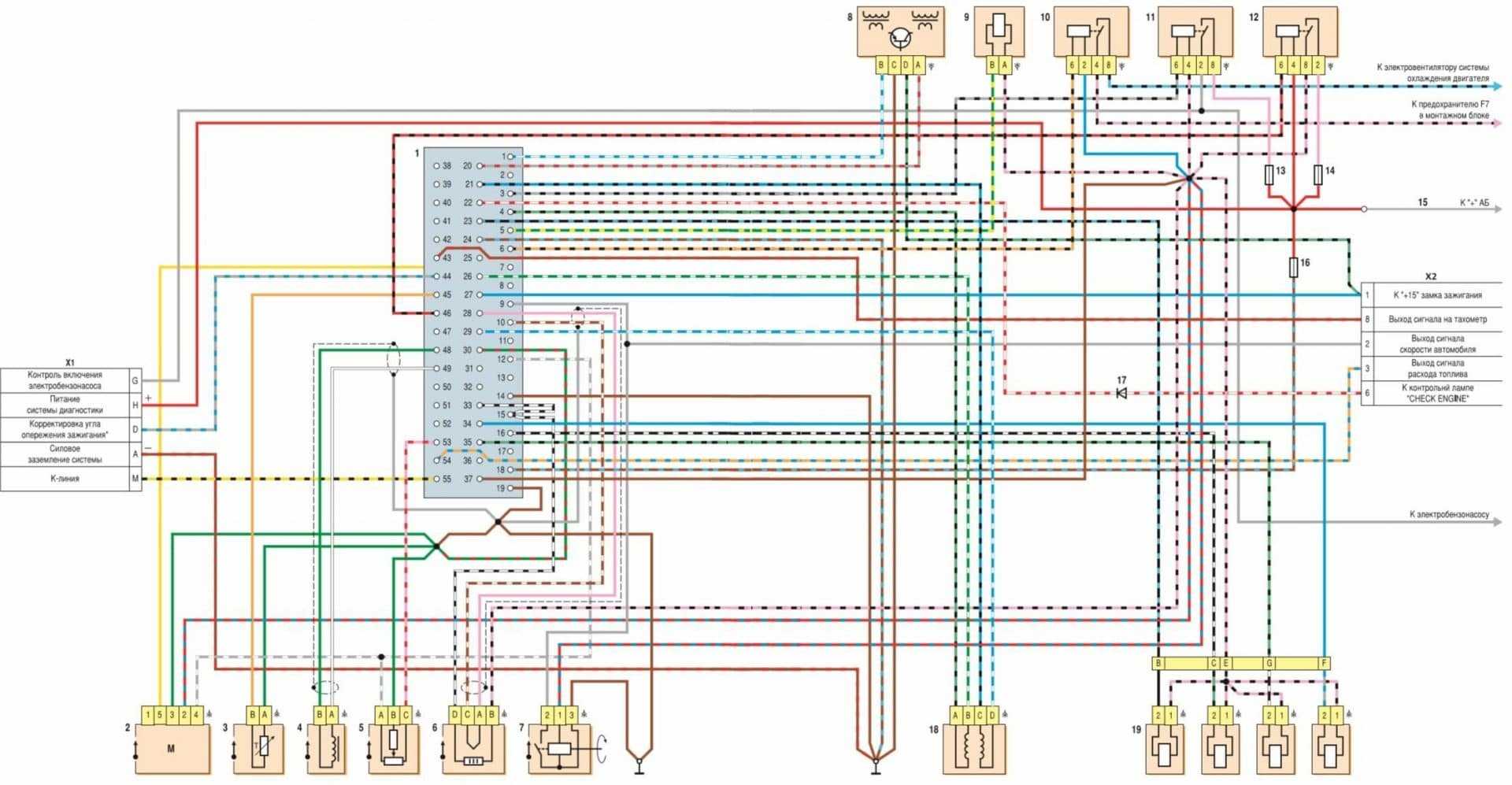 1 — разъем контроллера; 2 — датчик массового расхода воздуха; 3 — датчик температуры охлаждающей жидкости; 4 — датчик положения коленчатого вала; 5 — датчик положения дроссельной заслонки; 6 — датчик концентрации кислорода; 7 — датчик скорости; 8 — модуль зажигания; 9 — электромагнитный клапан продувки адсорбера; 10 — реле электровентилятора; 11 — реле электробензонасоса; 12 — главное реле; 13 — предохранитель, защищающий силовую цепь реле электробензонасоса; 14 — предохранитель, защищающий силовые цепи главного реле; 15 — плавкая вставка; 16 — предохранитель, защищающий цепь постоянного питания контроллера; 17 — диод; 18 — регулятор холостого хода; 19 — форсунки; Х1 — колодка диагностики; Х2 — колодка соединения с системой электрооборудования автомобиля.